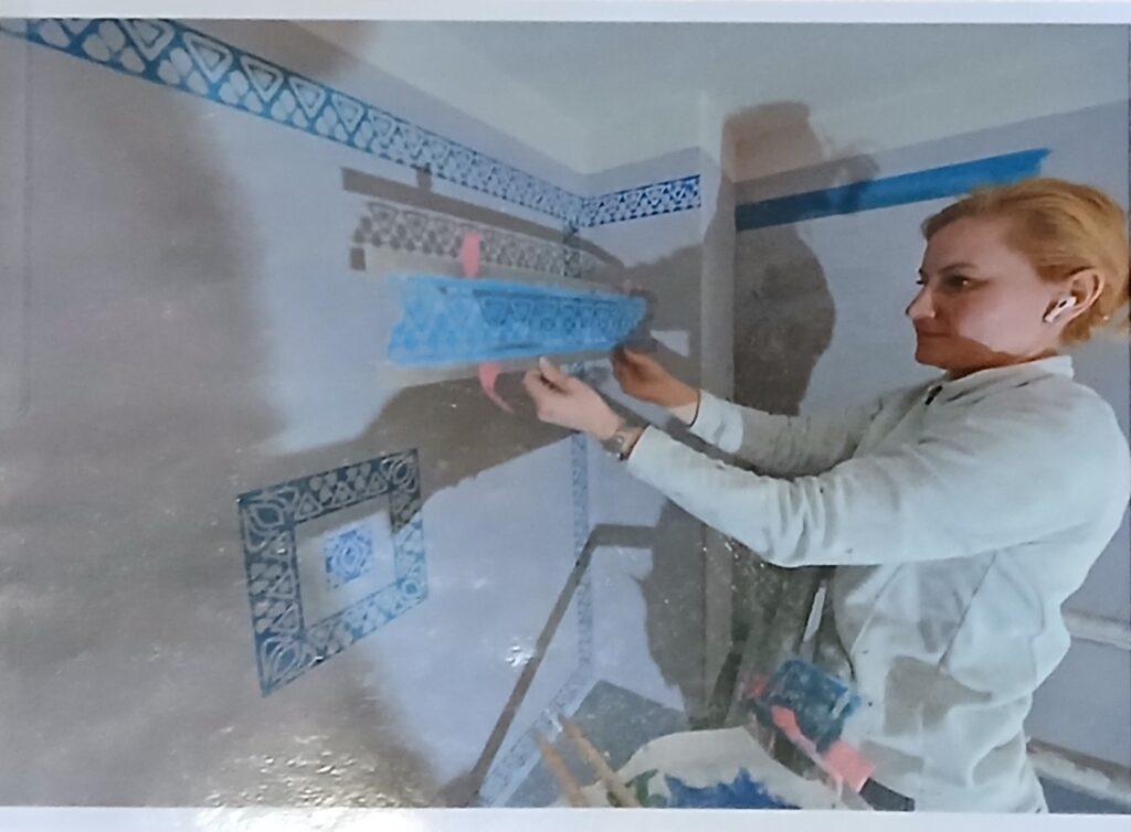 Mit dem Schwarz-Weiß-Bild war es gelüftet, einer Rekonstruktion stand nichts mehr im Wege. Dazu wurde eine Metallschablone gelasert, mit der passgenau das originalgetreue Motiv fortlaufend an die Wand gebracht werden konnte. Eine besondere Herausforderung stellte das großformatige Wandornament dar, das sich – bei genauem Hinsehen – einst an der Wand hinter dem vertäfelten Kopfende des Doppelbetts erhob. Dieses musste von Hand gemalt werden.