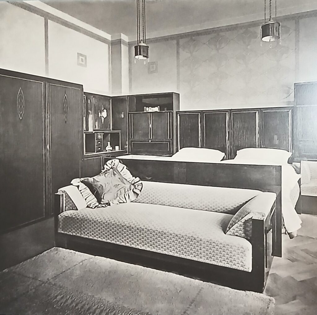 Das Große Haus Glückert ist gelebter Denkmalschutz. Vor allen Dingen seitdem die Experten im Ausstellungkatalog von 1908 atemberaubende Entdeckungen machten. Für das Schlafzimmer im Obergeschoss ein ausgesprochener Glücksfall: War doch auf einer zeitgenössischen Aufnahme die Raumausstattung inklusive der Wanddekoration von Albin Müller im Original zu sehen.
