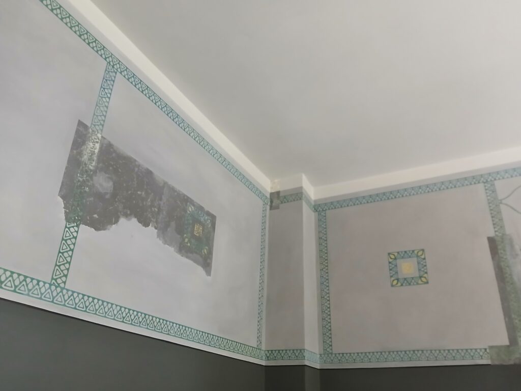 Bis dahin war man auf Untersuchungen der Wand und mikroskopische Analysen im Labor angewiesen. Man hatte auch bereits Ornament-Fragmente im Zimmer entdeckt und konnte deren (im Laufe der Jahre zunehmend oxidierten und dunkler gewordenen) Farbtöne zuordnen. Doch die genaue Gestaltung und der Verlauf des Ornamentbandes im Raum, das war bis dahin ein großes Geheimnis.