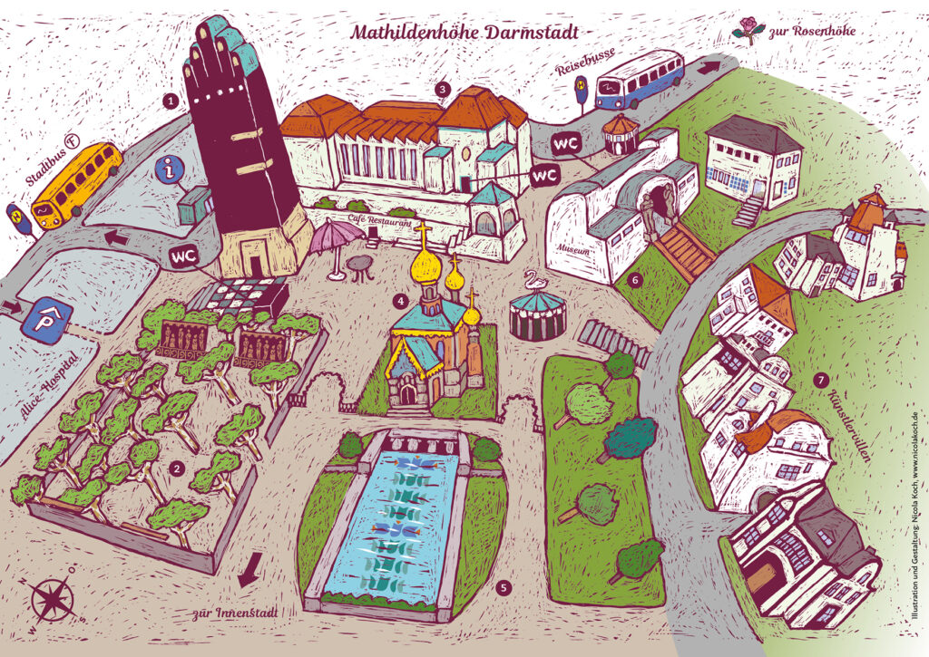 Illustration Mathildenhöhe: Nicola Koch | Orientierungshilfe | Gemeinschaftsprojekt Freunde der Mathildenhöhe und Förderkreis Hochzeitsturm